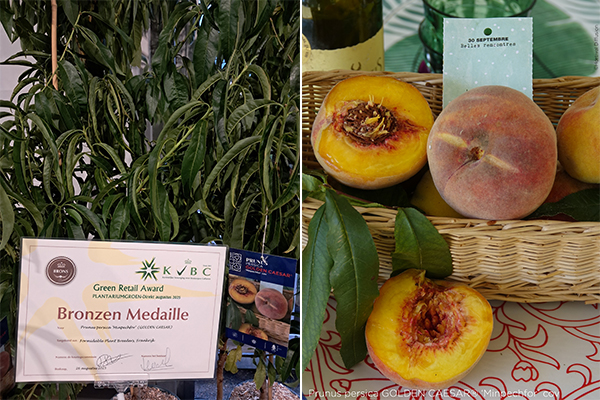 Le Prunus persica GOLDEN CAESARÂź âMinpechforâ cov, rĂ©compensĂ© pour ses fruits gĂ©nĂ©reux et sucrĂ©s, sa trĂšs haute tolĂ©rance Ă la cloque (validĂ©e par le centre de recherche de rĂ©fĂ©rence pour les fruits et lĂ©gumes) et sa rĂ©sistance Ă la sĂ©cheresse.